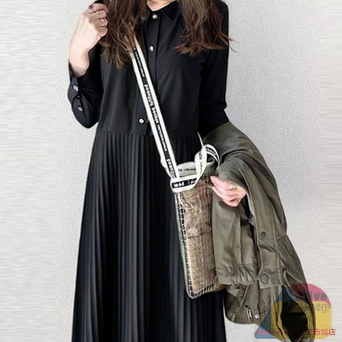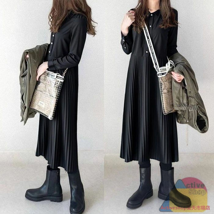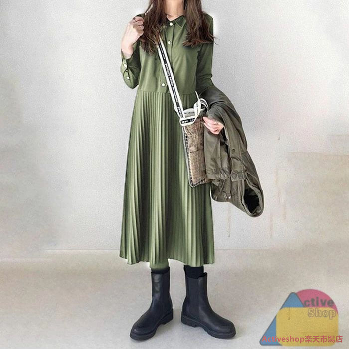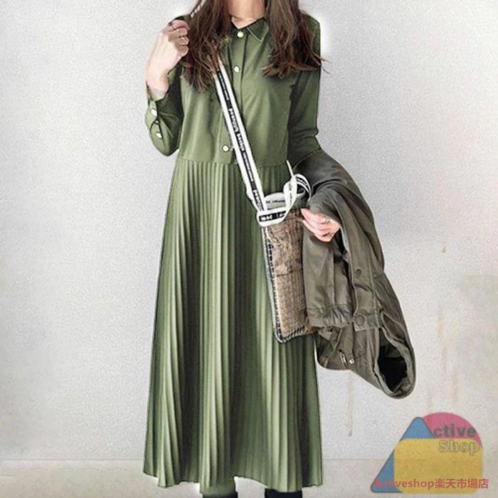 シャツワンピース 秋 冬長袖 ロング ブラック グリーン ブラウン S M L