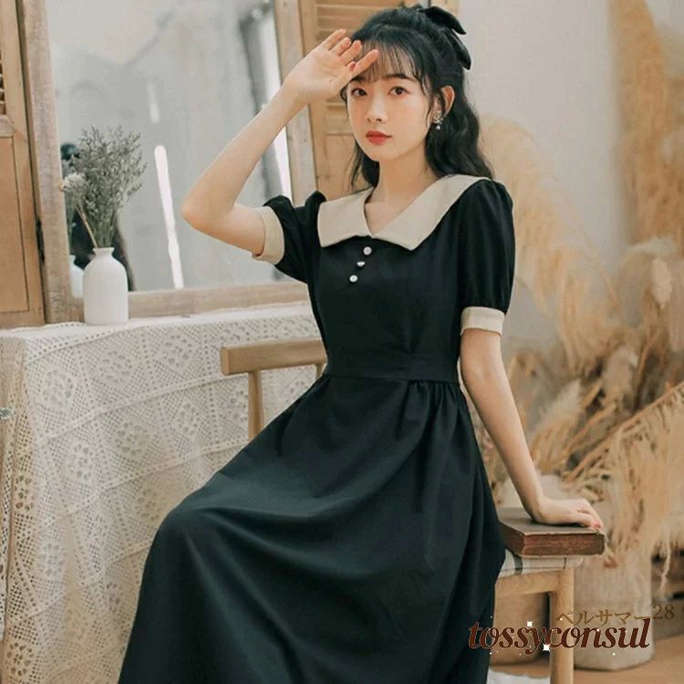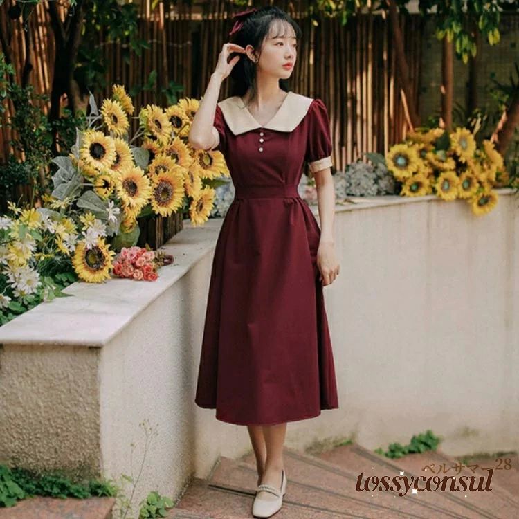 襟付き レトロ ワンピース 春 夏 レ レディースファッション 超目玉商品 ワイン ブラック S M L XL 2XL