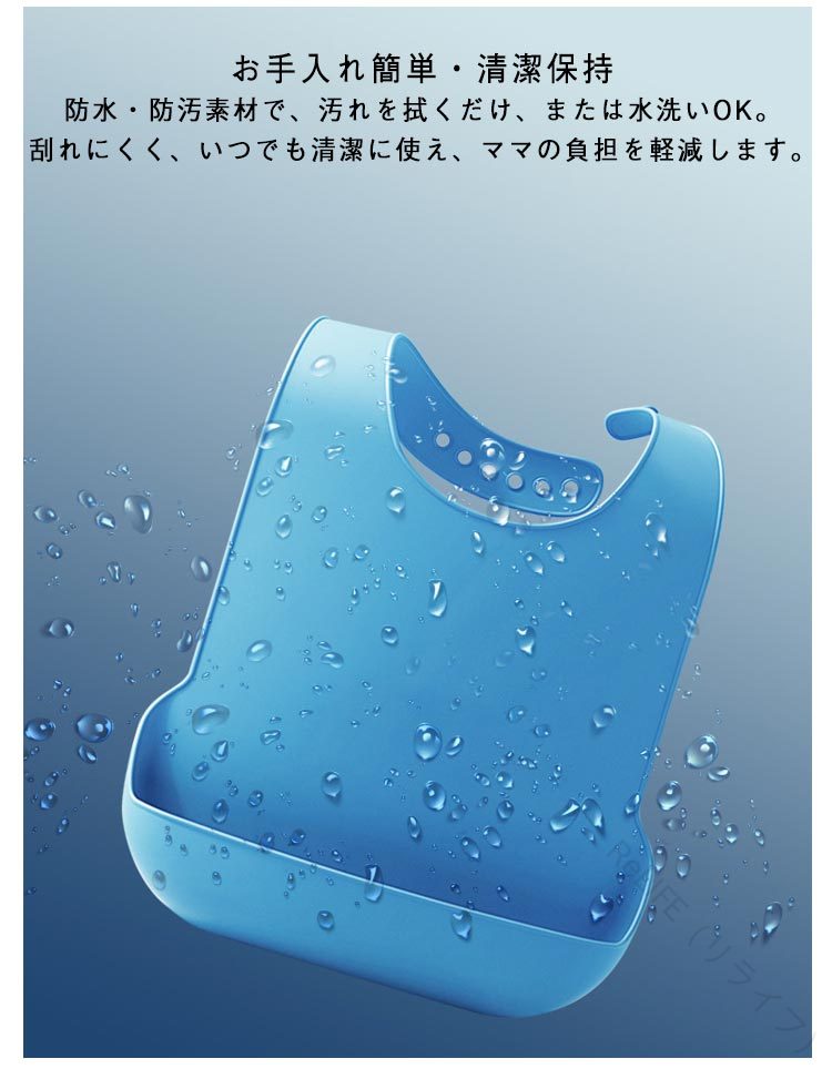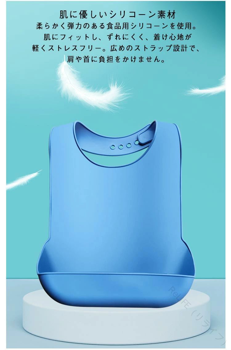 【2点セット】立体構造でこぼれない安心立体型すくい式デザイン+底部補強リブで、形が崩れず食べこぼしをしっかりキャッチ。お子様の動きにもへたらず、いつでも清潔な服で食事が楽しめます。肌に優しいシリコーン素材柔らかく弾力のある食品用シリコーンを使用。肌にフィットし、ずれにくく、着け心地が軽くストレスフリー。広めのストラップ設計で、肩や首に負担をかけません。6段階調節で長く使える首回りは6段階の調整可能。成長に合わせて最適なフィット感をキープします。縁がなめらかで首に食い込まず、快適な着け心地を実現。お手入れ簡単・清潔保持防水・防汚素材で、汚れを拭くだけ、または水洗いOK。刮れにくく、いつでも清潔に使え、ママの負担を軽減します。環境にも優しい素材安全性の高い・保素材を使用。赤ちゃんにも地球にもやさしい製品です。