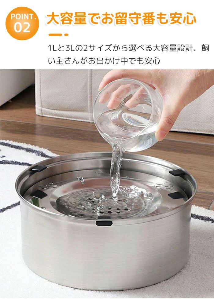 1Lと3Lの2サイズから選べる大容量設計。こまめに水を追加する必要がなく、飼い主さんがお出かけ中の「お留守番」でも、水分不足の心配がありません。特に夏場の水分補給や、多頭飼い、中型犬・大型犬のいるご家庭に最適なペット給水器です。