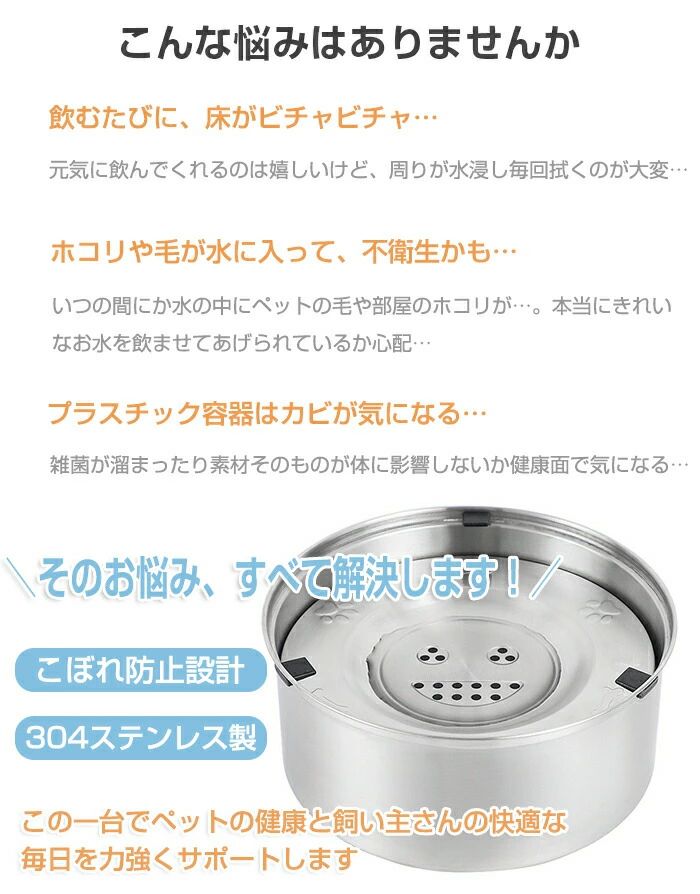 本体は、食器にも使われる高品質な食品グレードの304ステンレスを使用。プラスチック製と比べて傷がつきにくく、雑菌の繁殖やカビを防ぎます。錆びにくく耐久性も抜群なので、毎日のお手入れで、いつでも清潔で安全な飲み水を愛犬・愛猫に提供できます。