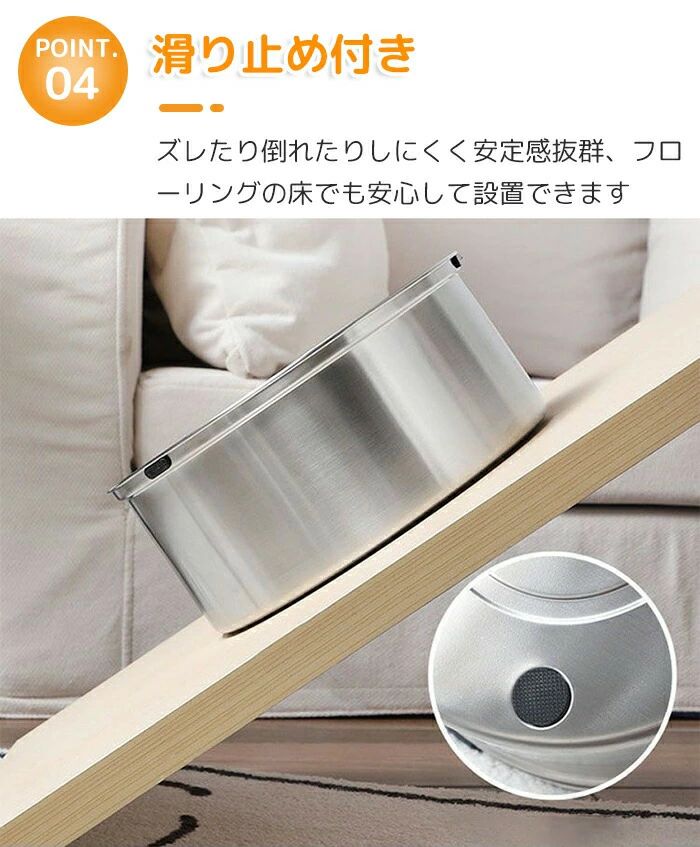 容器の底部には、シリコン製の滑り止めが付いています。元気なペットが鼻で押したり、前足をかけたりしても、器がズレたり倒れたりしにくく安定感は抜群。フローリングの床でも安心して設置できます。