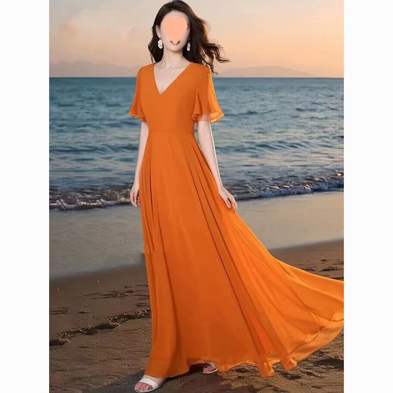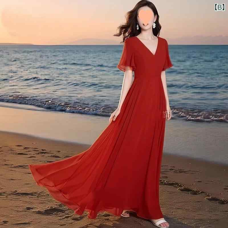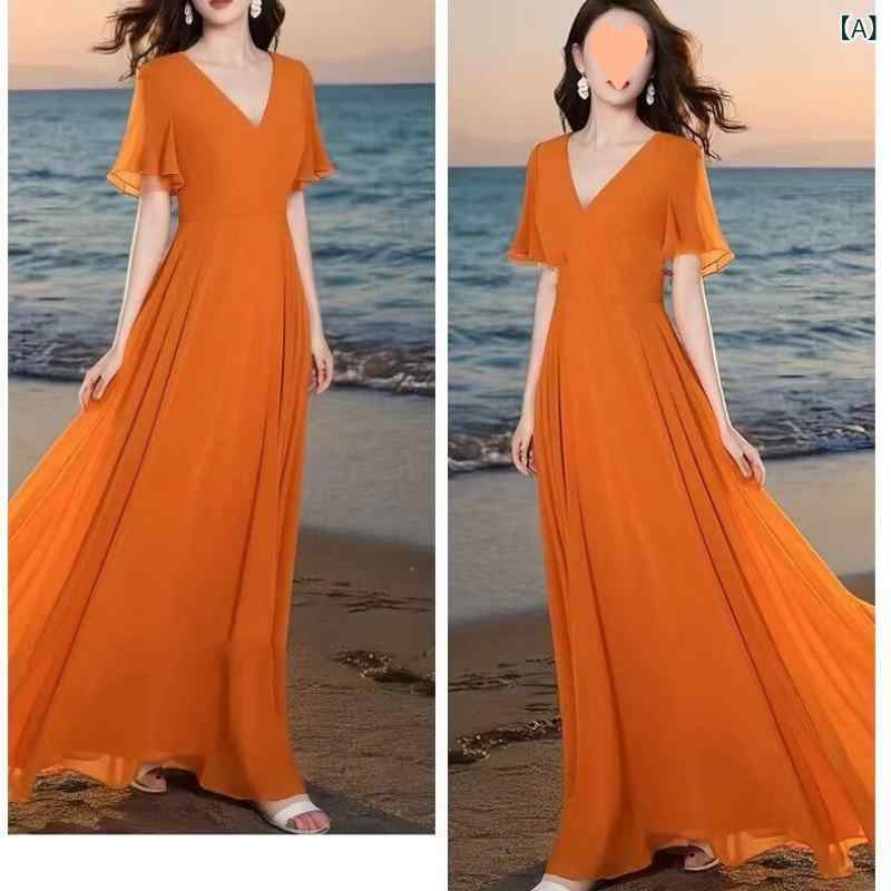 ワンピース レディース 春夏 Vネック ワンピース 新登場! A:オレンジ色 B:赤 M L XL 2XL 3XL 4XL 5XL