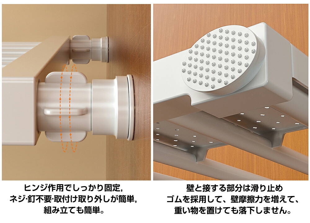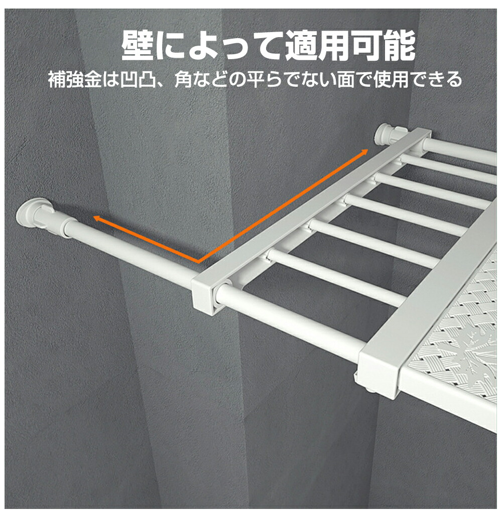 【棚板付き滑り止め安定】壁に接着する部分は滑り止めゴムが付き、摩擦力を増加して、各種壁面にも気軽に対応します。ネジやクギを使わずに壁に突っ張るので、賃貸などの壁に穴がある心配もなく、弱粘着な壁紙が剥がれる心配もないです。