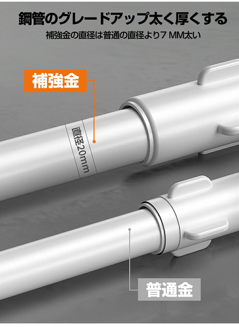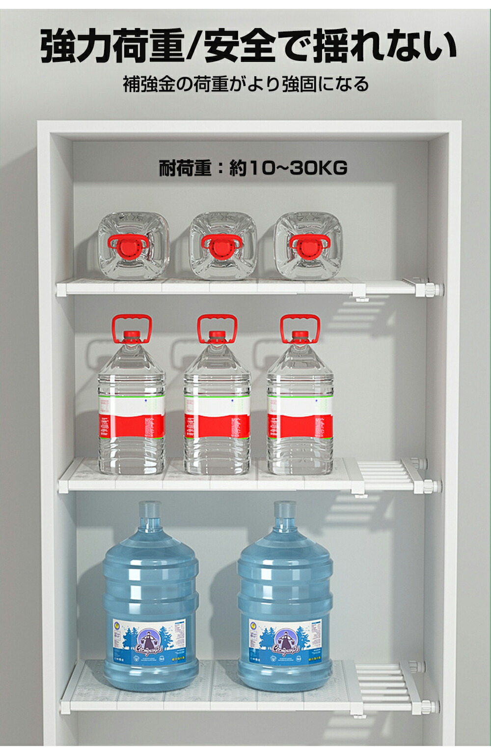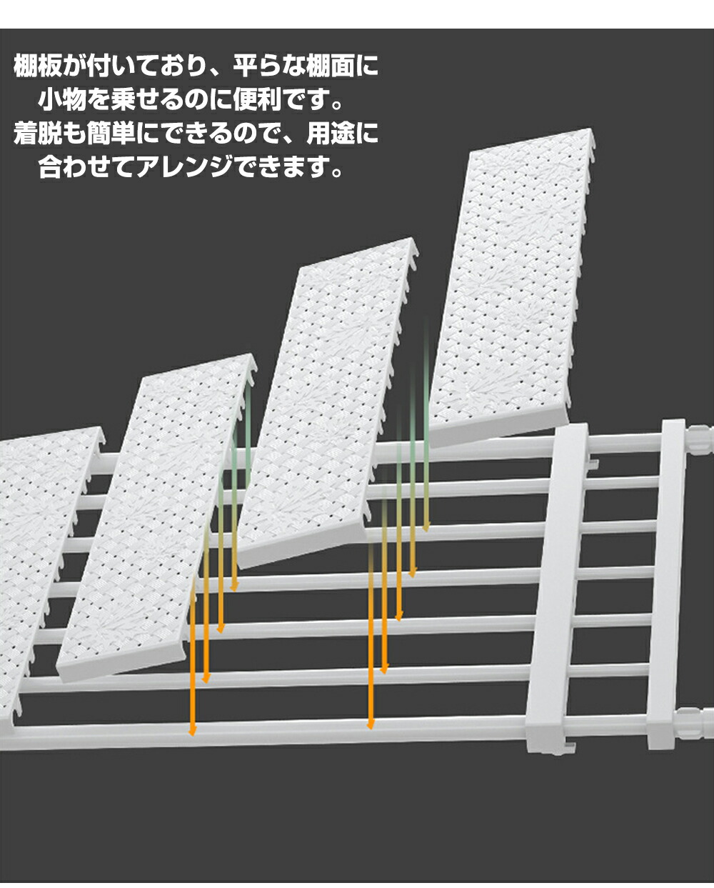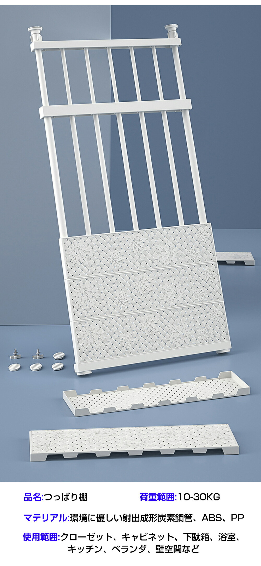 商品特徴 【耐荷重が強い】つっぱり棚はステンレス製パイプ+ABS樹脂 合成ゴム 製なので、重い物を乗せでも湾曲しなく、水分等を触れてもサビやカビが出ないです。