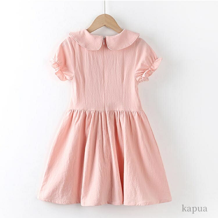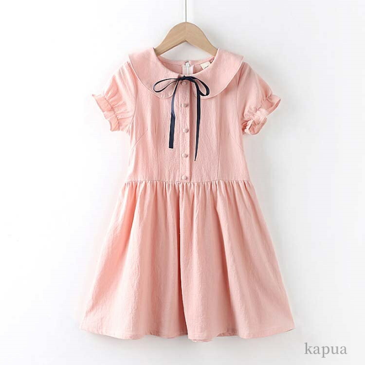 無地 リボン付き フレアワンピース 半袖 ミディアムワンピース 襟付きワンピース 女の子 子供服 ワンピース レディース