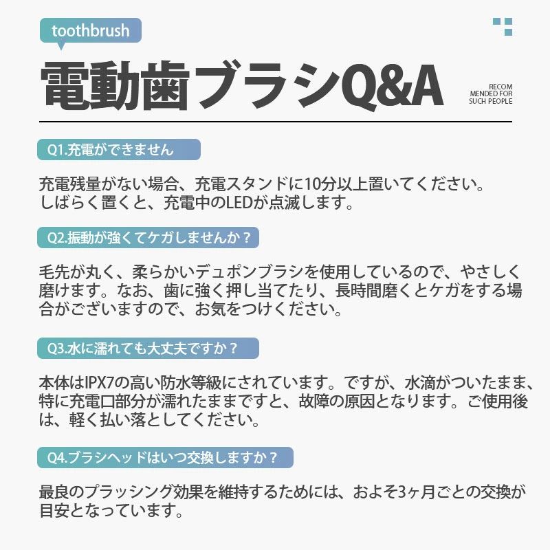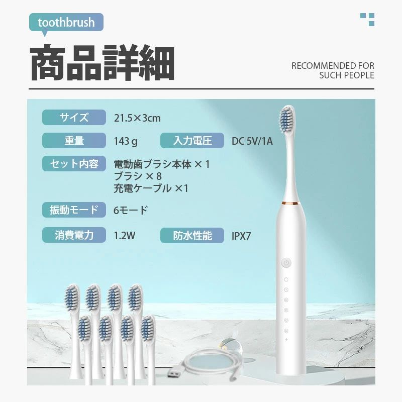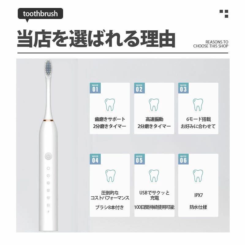 防水設 IPX7 歯ブラシ 超音波 本体 充電式 替えブラシ8本付き 替えブラシ 電動歯ブラシ 音波歯ブラシ