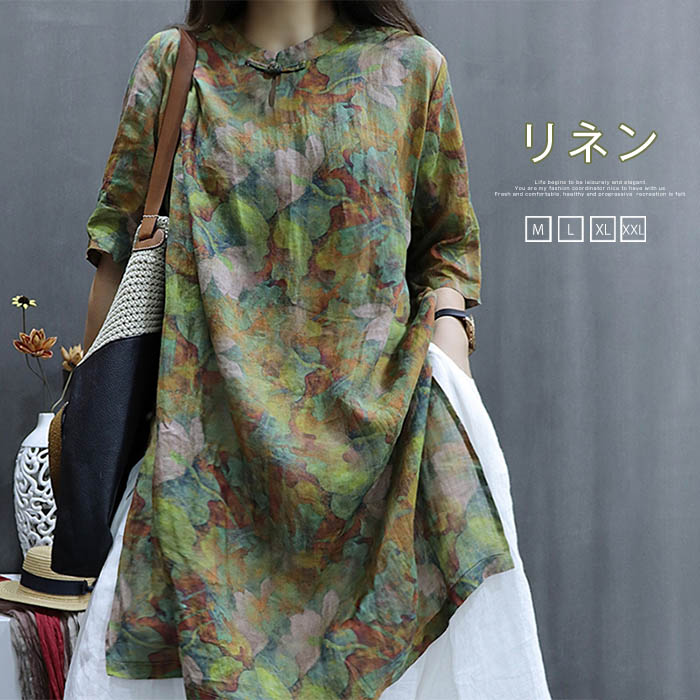 花柄 ブラウス レディース 夏 5分袖 半袖 綿麻風 チュニック ワンピース チャイナボタン シャツワンピース スリット スタンドカラー ロングブラウス トップス カジュアル おしゃれ ロング