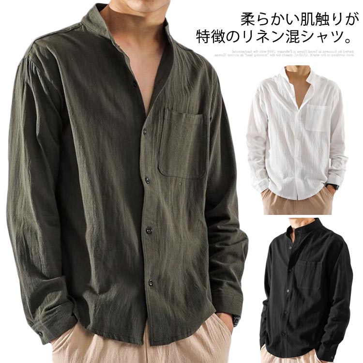 リネンシャツ 長袖 トップス シャツ スタンドカラー メンズ 羽織 麻混 リネン混 カジュアルシャツ 無地 シンプル おしゃれ 春 オフィスワーク 秋 夏 ビジネス 夏服 定番 カジュアル