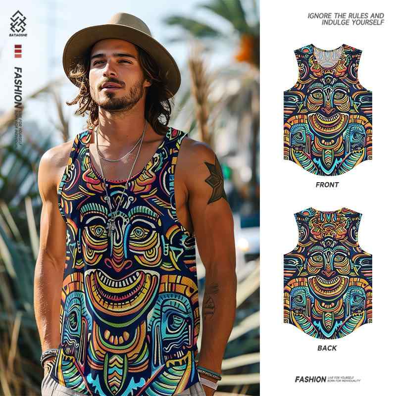 メンズ タンクトップ カラフル 夏 エスニック 派手 個性的 アート カジュアル アメリカン ラウンドネック 南国 トップス