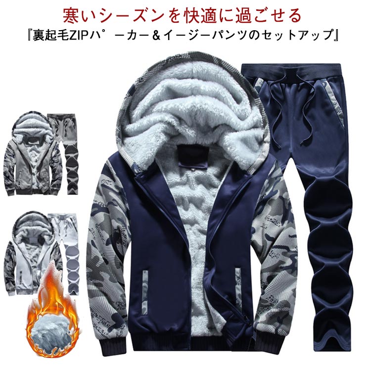 メンズ セットアップ 厚手 裏ボア 裏起毛 スウェットパーカー ボアパンツ 上下セット 2点セット スウェット フード付き ジップアップパーカー 秋冬 イージー パーカー 迷彩 ジョガーパンツ