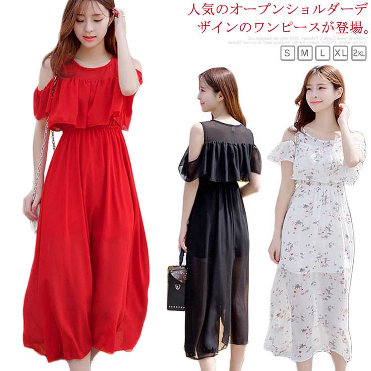 オープンショルダー ワンピース 肩開き レディース シフォンワンピース 花柄 フレアワンイース 肩あき 肩出し ミモレ丈 夏 春夏 肩見せ
