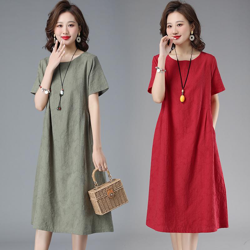 ワンピース ミモレ丈 半袖 レディース 大人 春夏 ゆったり カジュアル 綿麻 無地 ドレス シンプル きれいめ Vネック かわいい ロングワンピース 着瘦せ ナチュラル 大きいサイズ 3 体型カバー
