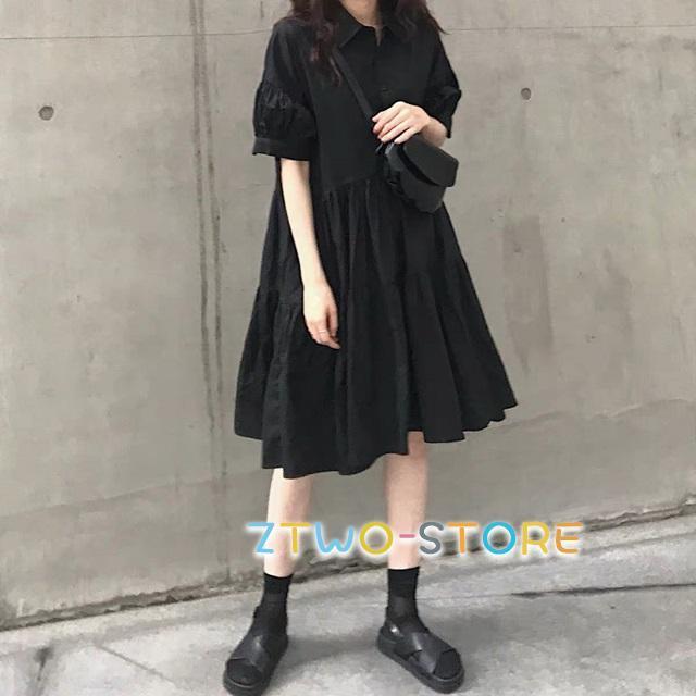 カジュアル ワンピース 膝丈 ミディ丈 シャツワンピース 黒 半袖 五分袖 ティアードワンピース ゆったり シンプル ゆるワンピ レディース