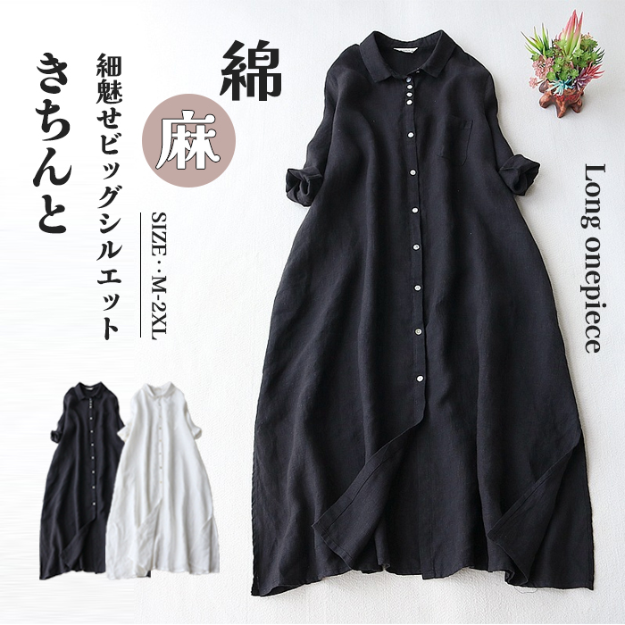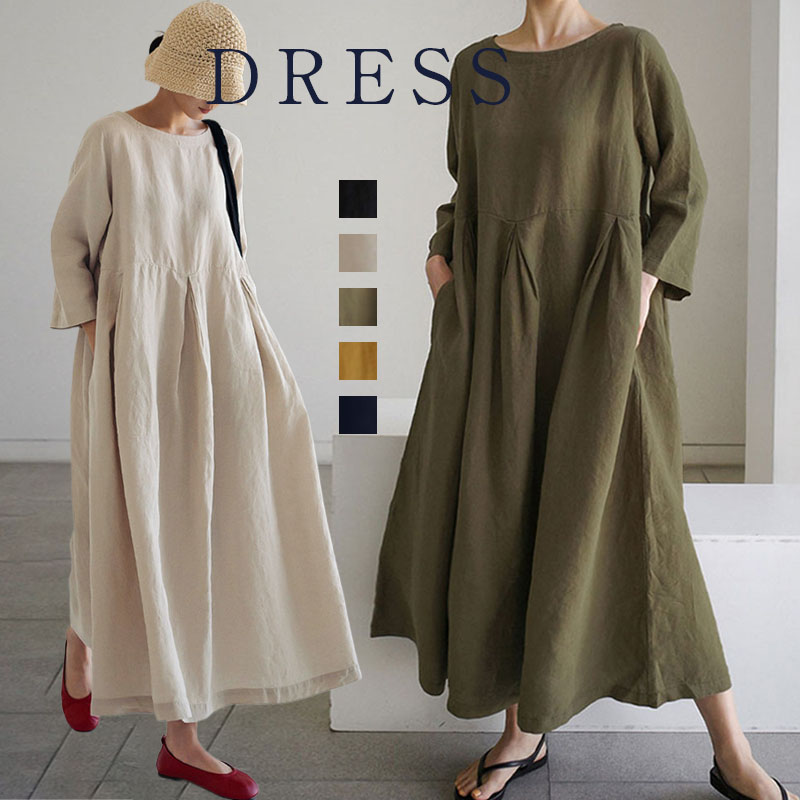 ゆったり 夏 春 大人 カジュアル 大きいサイズ 長袖 九分袖 綿麻 コットンリネン 春夏 レディース ワンピース ロングワンピース