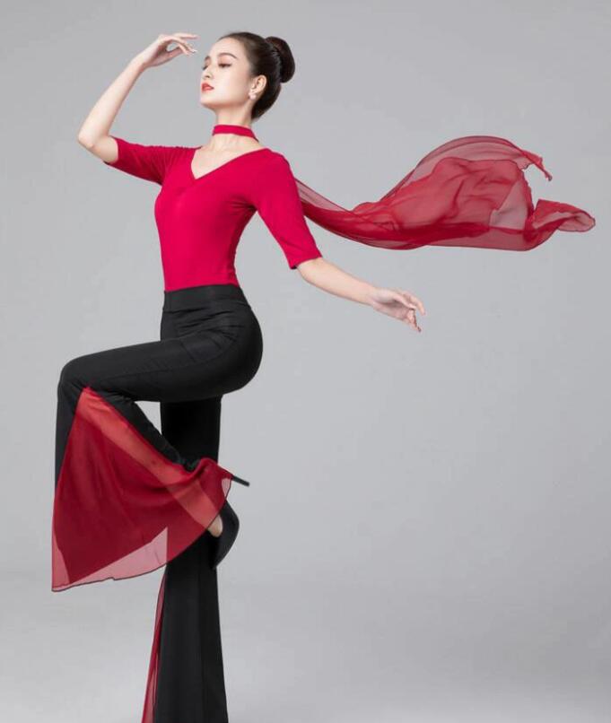 3点セット バレエ 古典ダンス 社交ダンス 衣装 五分袖 レオタード ロング丈 パンタロン ラッパ ベルボトム ワイドパンツ フレアパンツ シフォン切替 ヨガ ベリーダンス トップ ストレッチ