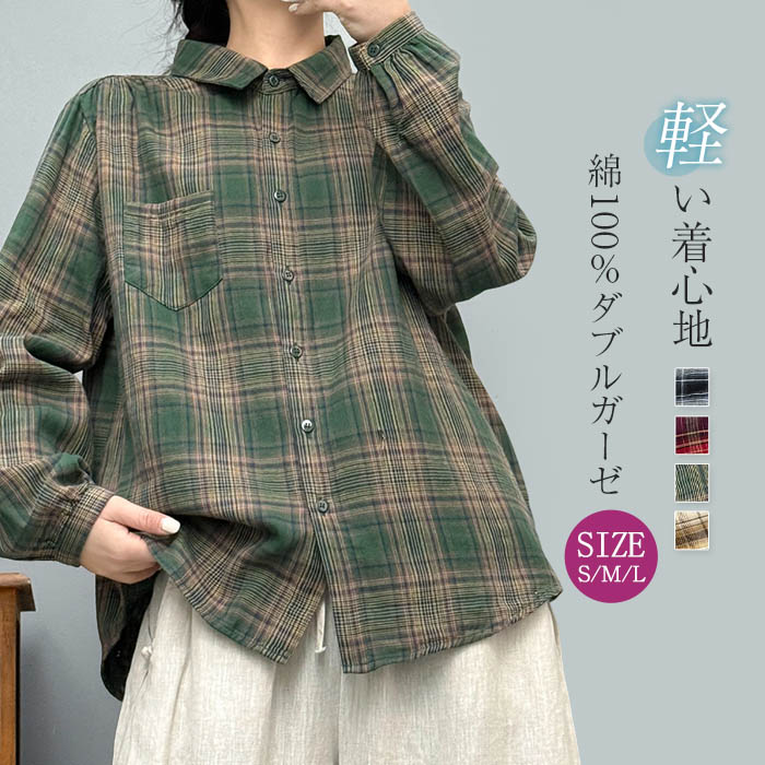 ガーゼ シャツ チェック柄 レディース ガーゼシャツ ダブルガーゼ 長袖 レディースシャツ トップス 春秋 ゆったり ゆる 体型カバー シャツブラウス ガーゼブラウス 羽織り