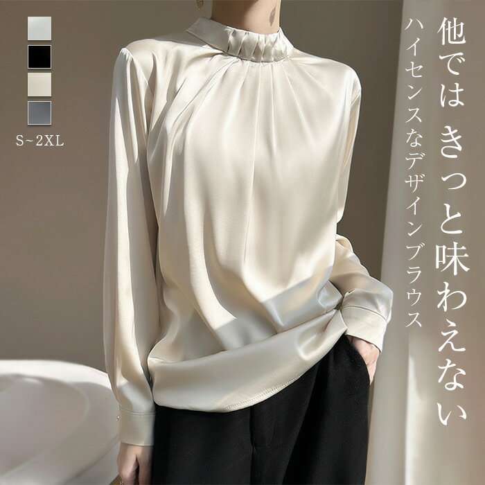 ブラウス レディース 長袖 タック モックネック レディースブラウス シャツブラウス コーデ 春 秋 通勤 オフィス ビジネス サテン風 トップス フォーマル