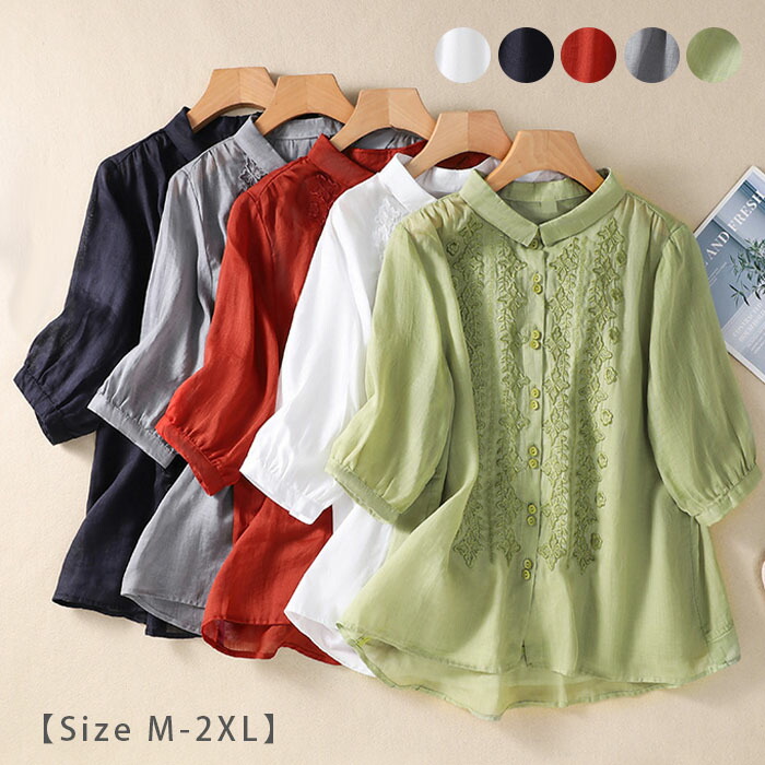 丸襟 シャツ 7分袖 レディース 刺繍 総柄 ブラウス コットン 7分袖シャツ 薄手 夏 トップス 春夏 ゆったり ファッション シンプル 体型カバー カジュアル 綿 涼しい オフィス 柔ら きれいめ