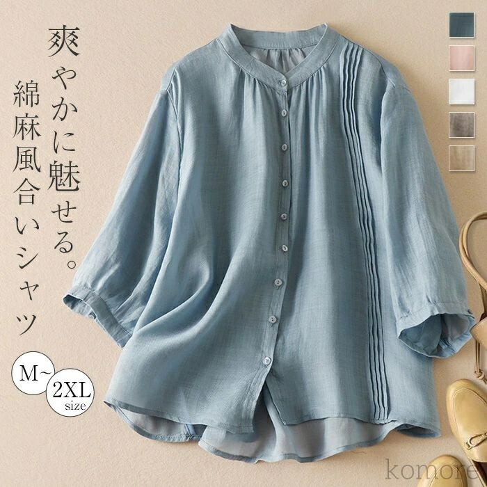 シャツ ブラウス レディース 7分袖 春 秋 ノーカラー 綿麻 トップス バンドカラー フェミニン 着回し シンプル 羽織り