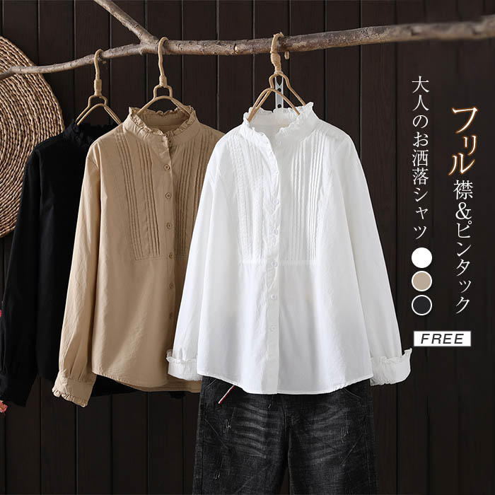 フリル襟 シャツ ブラウス 長袖 立ち襟 ピンタック シャツブラウ