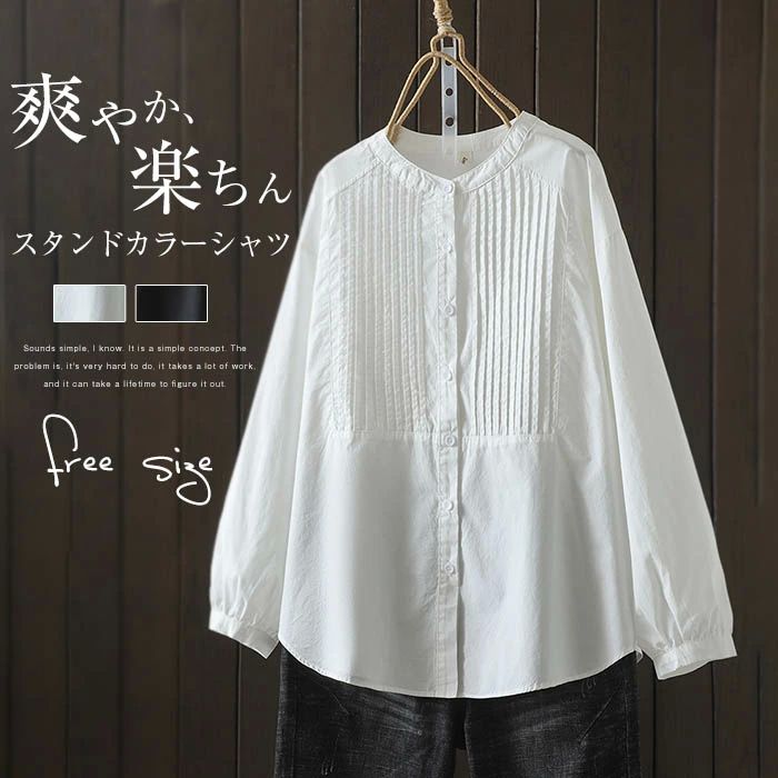 シャツ ブラウス レディース 長袖 春 秋 ノーカラー 綿 トップス コットン ホワイト 白シャツ バンドカラー フェミニン 着回し シンプル おしゃれ カジュアル ゆったり 女性らしい 大人