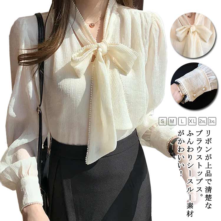 オフィス 長袖 オフィス ブラウス レディース 白 ボウタイリボン 透け感 大きいサイズ ボウタイ