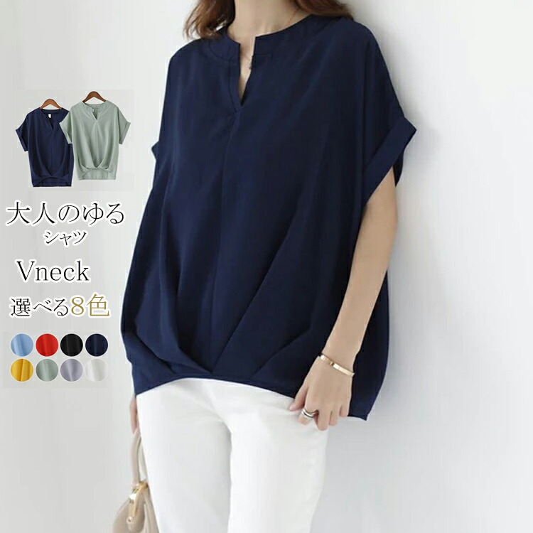 選べる8色&5サイズ Vネック綿麻風ブラウス シャツブラウス 半