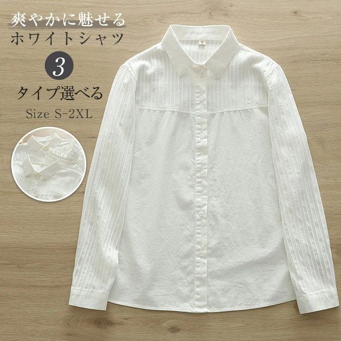シャツ ブラウス レディース 長袖 春 秋 ホワイト 綿 トップス コットン 白シャツ 3タイプ襟 フェミニン 着回し シンプル おしゃれ カジュアル ゆったり 女性ら 大人