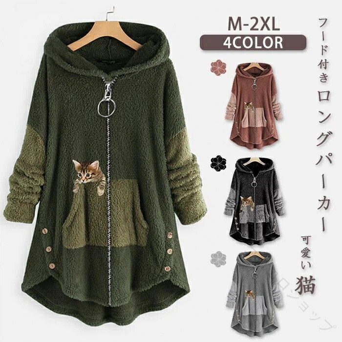 ふわふわボア素材で暖かく可愛い猫柄が特徴 フード付きで防寒性抜群 レディースにおすすめのロング丈パーカー