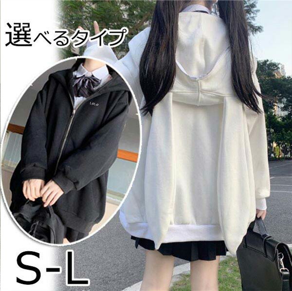 パーカー レディース トップス プルパーカー ドロップショルダー フード付き ホワイト ブラック 長袖 ジップアップパーカー ゆったり 楽チン キュート カジュアル リラックス うさ耳 う 体型カバー