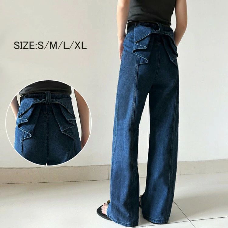 ロン 着回し力抜群 パンツ ボトムス 後ろ姿映え フリル付き ハイウエスト レディースバックリボンデニムパンツ ステッチデザイン