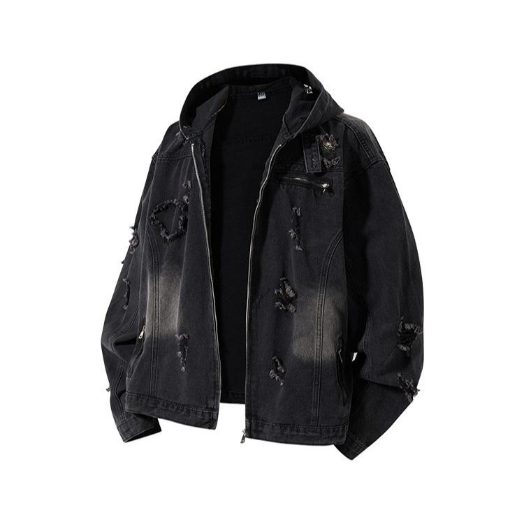 ジャケット メンズ デニム フード付き レトロ ダメージ加工 ゆったり カジュアル ストリート スタイル 加工 ビンテージ風 フィット ウォッシュ
