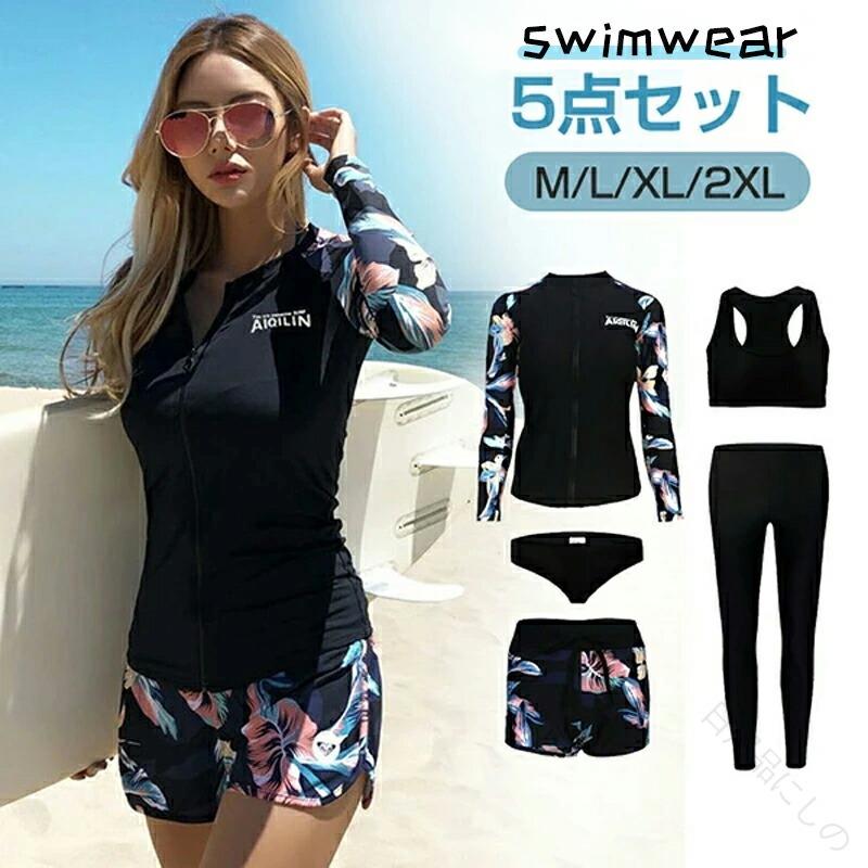 水着 レディース 5点セット ラッシュガード セット 長袖 前開き カット 体型カバー フィットネス ペアルック レギンス ビキニ ハーフパンツ 上下セット ブラ 吸汗速乾 セパレート シ パンツ