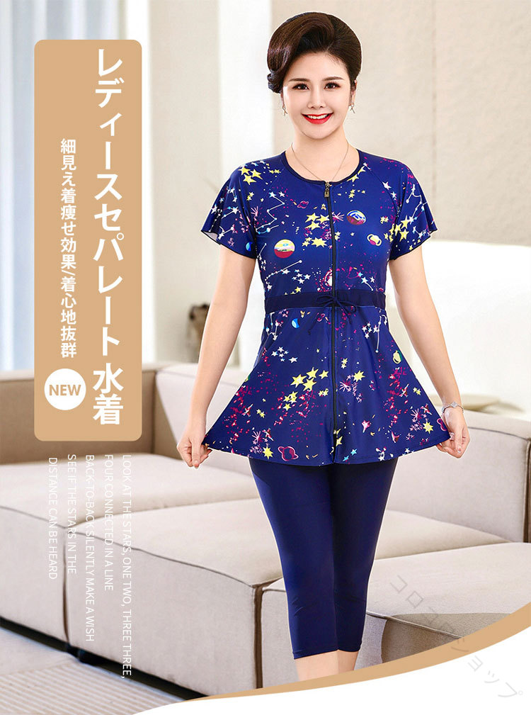 レディース 水着 シニア セパレート 2点セット ワンピース水着 フィットネス水着 七分丈パンツ 体型カバー タンキニ ロング丈 スパッツ 大きいサイズ 半袖 花柄 ママ 中高年 温泉 お母さん 保守