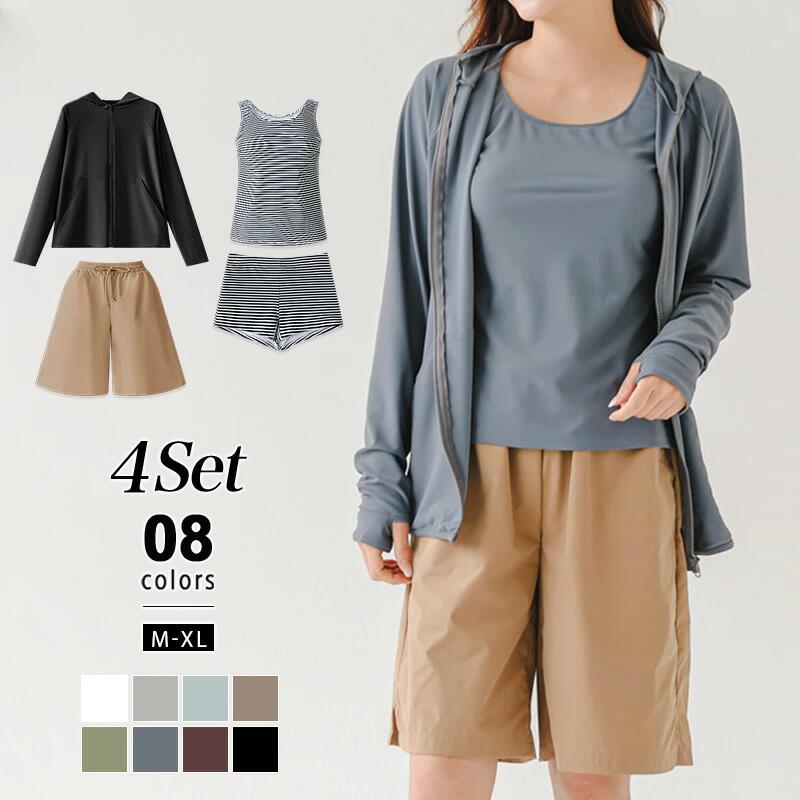水着 ラッシュガード 体型カバー 長袖 指穴 パーカー点セット レディース タンキニ ハーフパンツ カップ付き タンクトップ セパレート 上下 セット パンツ パッド付き 大きいサイズ セットアップ