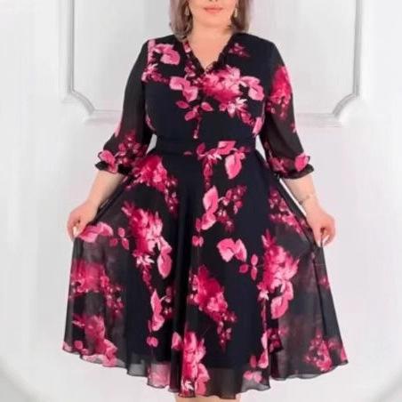 レディース ビッグサイズ Vネック 花柄 ワンピース ゆったりシルエット プリントドレス 女性用 ミディ丈 快適 伸縮性x2 ドレス