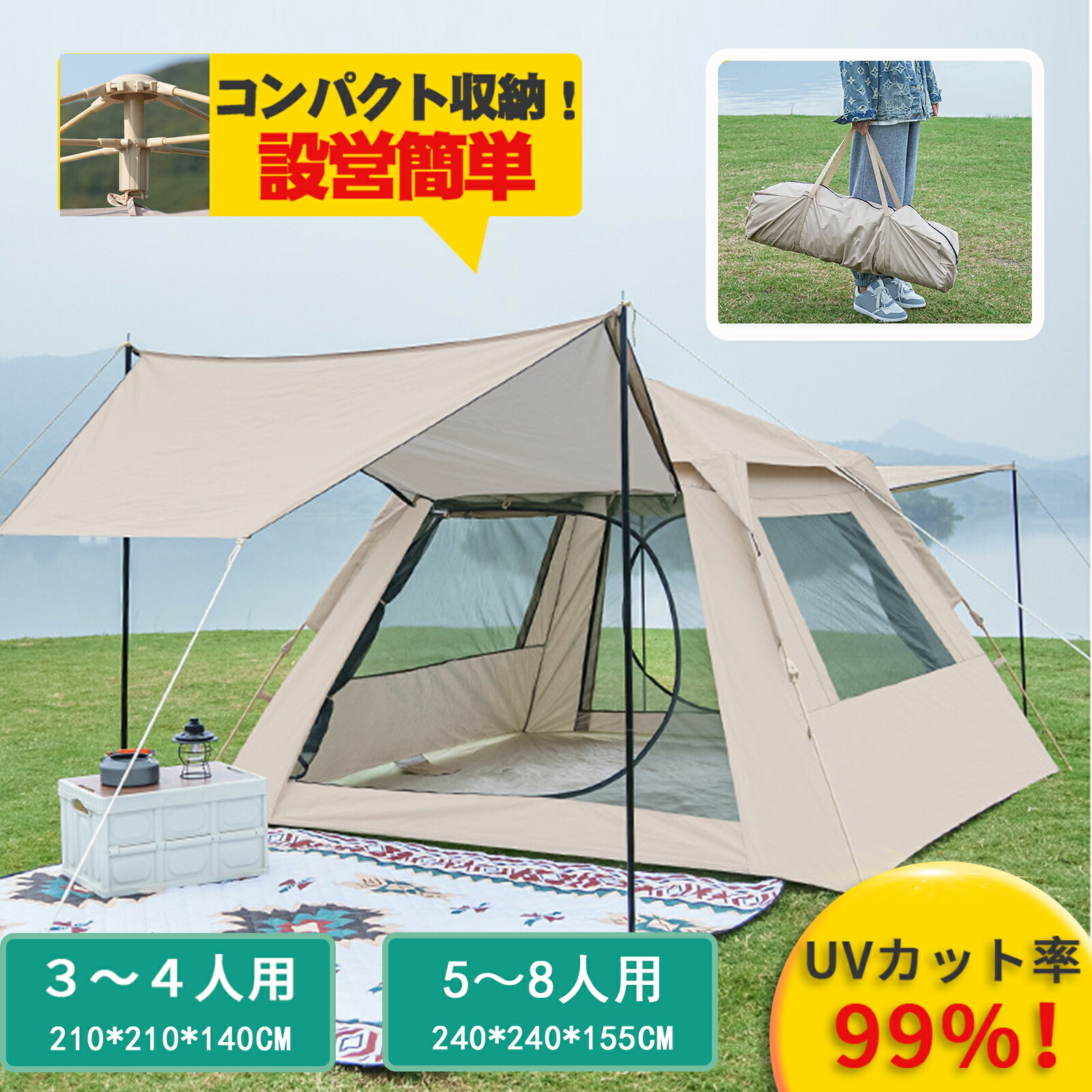 【10倍+15%クーポン3月20日20:00から】防水タープ テント 設営簡単 軽量 おおしゃれ 登山 花見 海水浴 キャンプ用品 収納袋付 サイズ:240 5~8人用 Mサイズ:210 3~4人用