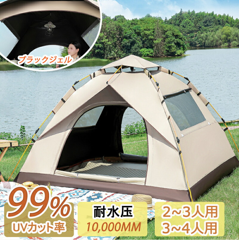 ブラックジェルUVカット テント アウトドア 公園 1~2人用 3~4人用 フルクローズ キャンピングテント ドームテント ビーチテント 折りたたみ 簡易テント 収納バック付き 2ドア メッシ 高耐水