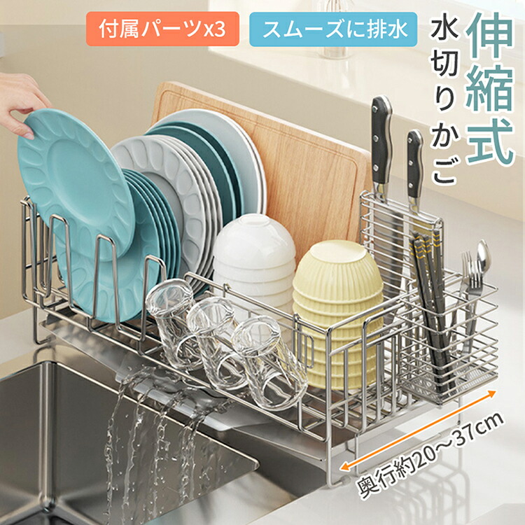 水切りラック 伸縮式 ステンレス 水切りかご 大容量 水切りカゴ シンク上 横置 水を自動で流すトレー付き キッチン 省スペース 組み立て簡単 箸置き 自動排水 台所 収納 洗い おしゃれ 流れ 食器