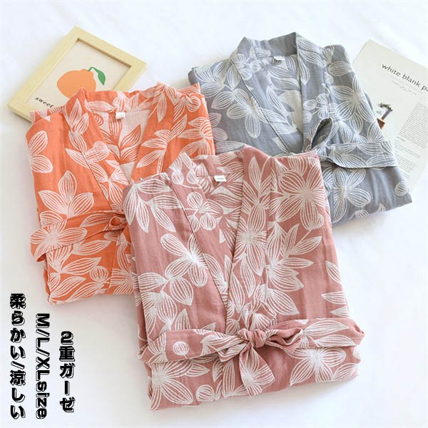 綿 ルームウェア パジャマ 寝巻き 男女兼用 ガーゼ 浴衣 ガウン お風呂上がり バスローブ ホワイト レディース メンズ 花柄 葉柄 2重ガーゼ 前開き 夏素材 旅館 温泉 通気性 涼しい 部 介護