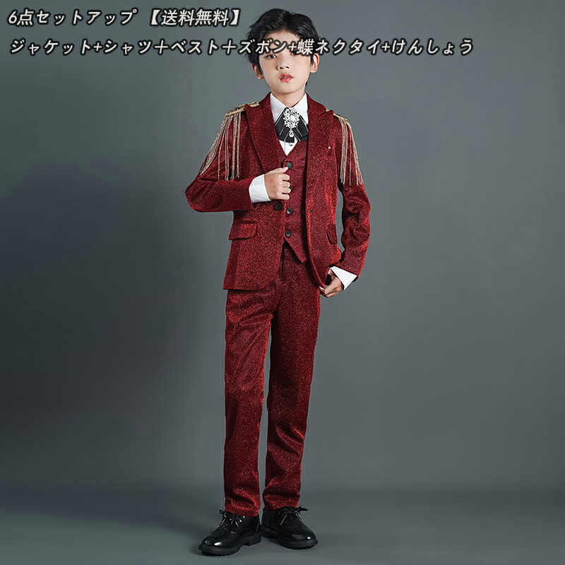 キッズスーツ 子供スーツ ワインレッド 6点セットアップ ジャケット+シャツ+ベスト+ズボン+蝶ネクタイ+けんしょう 肩部分のアクセサリ 七五三 子供服 肩パッド付き 男の子スーツ 出演 キッ 入学式