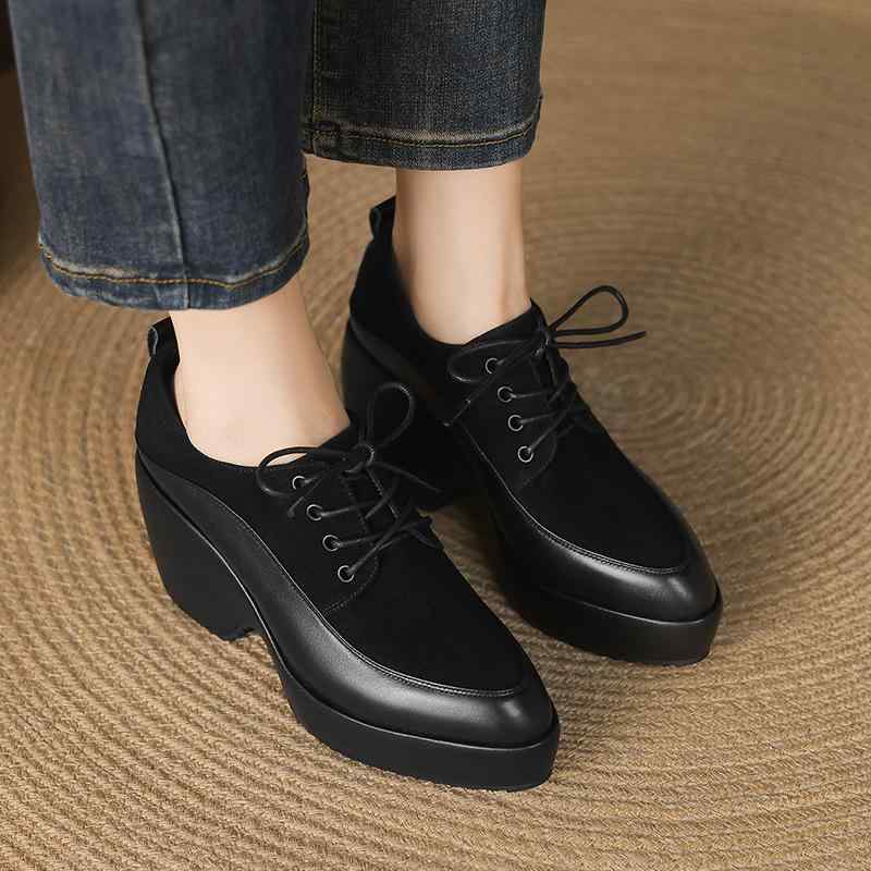 厚底パンプス レディース 9cmヒール 太ヒール 低身長向け 本革 レザー ブリティッシュ レースアップ ポインテッドトゥ 深履き カジュアル 通勤 普段使い バイカラー