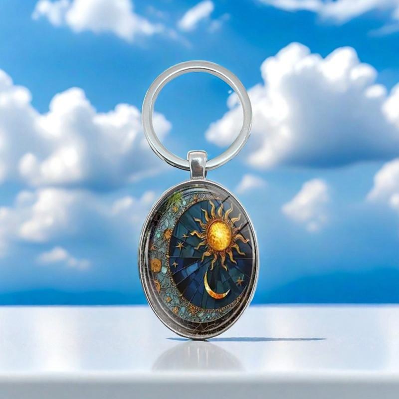キーホルダー 太陽と月 モチーフ 楕円形 亜鉛合金製 キーリング キーチェーン バッグチャーム 車の鍵 スマートキー 鞄 シンプル ユニセックス ファッション アクセサリー おしゃれ