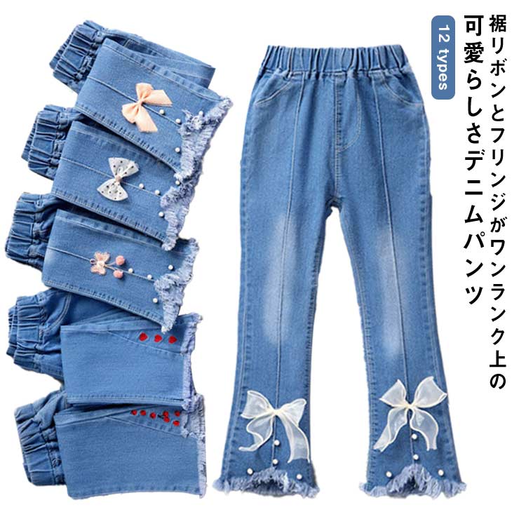 デニムパンツ 子供服 レース付き リボン フレアパンツ 裾フレア ロングパンツ 女の子 ガールズ