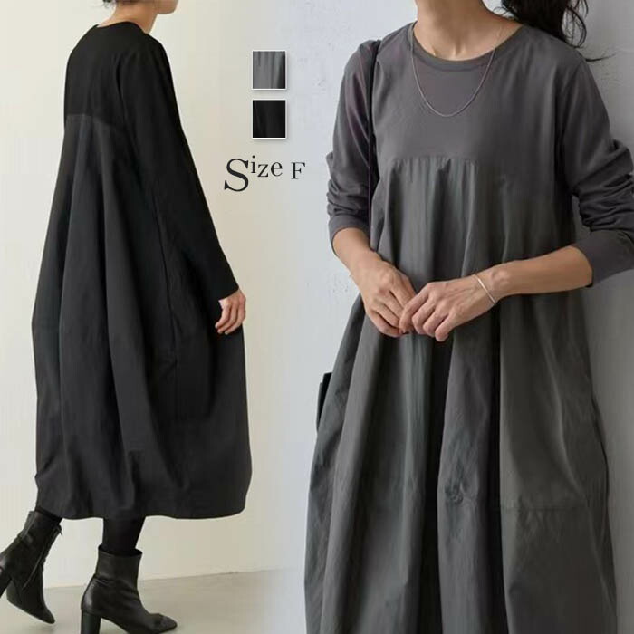 バルーン ワンピース レディース 秋 冬 春 リブニット 無地 切り替え 異素材 ロング コットン 秋冬 長袖 フレアワンピース きれいめ バルーンワンピー aライン 大人 ハイウエスト