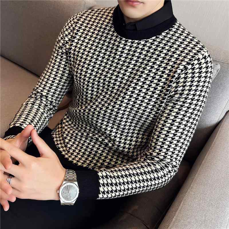 ニット メンズ 男性用 フェイクレイヤード 重ね着風 千鳥格子 シャツ襟 長袖 配色 切り替え スリム 細身 ポリエステル 化繊混紡 伸縮性 柔らかい ソフト 韓国ファッション カジュアル 普段 厚手