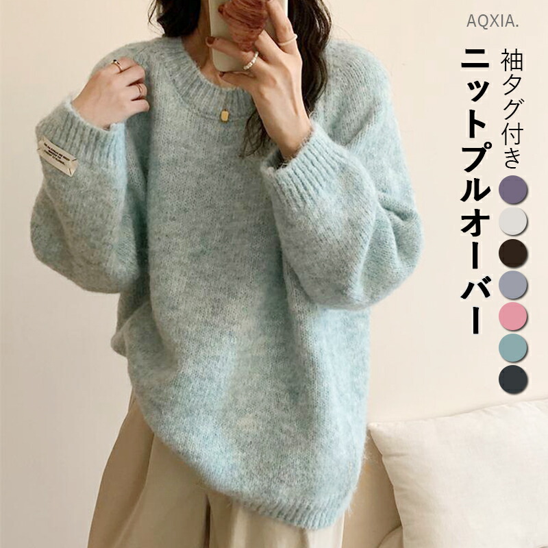 トップス ニット レディース 長袖 ラウンドネック ゆったり 袖タグ付きニットプルオーバー オーバーサイズ
