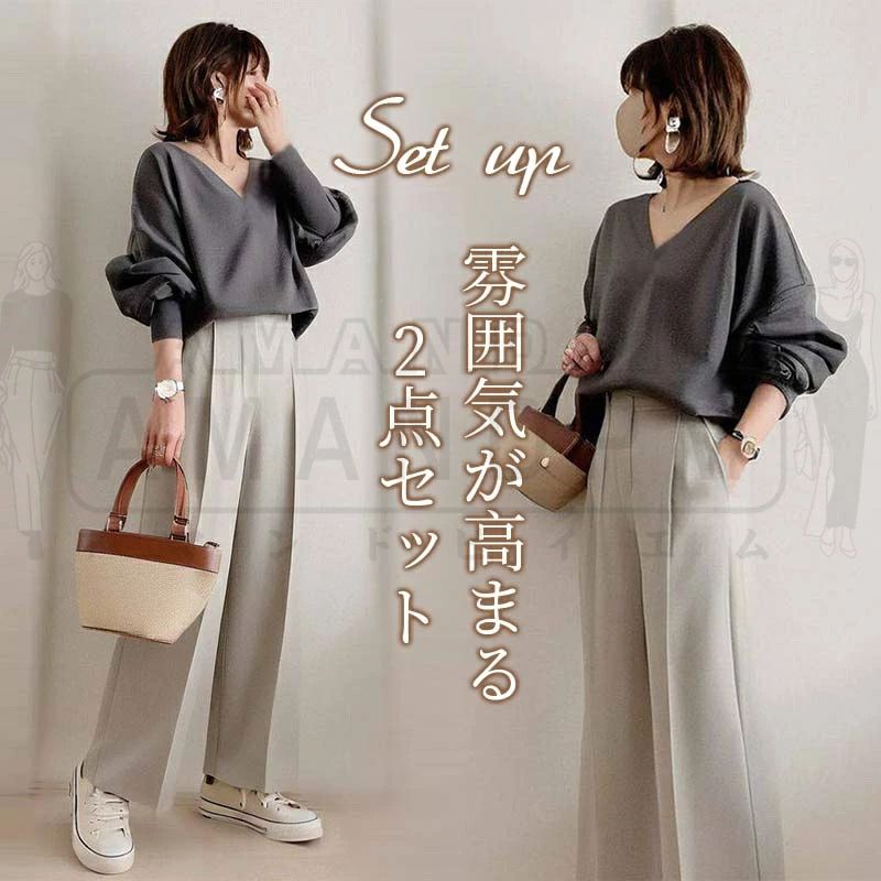 セットアップ レディース カジュアル きれいめ 春 秋 韓国 スエット パンツ トップス Vネック ワイドパンツ 低身長 長袖 2点セット 上下セット ロング ゆったり ボトムス 大きいサイズ 無地