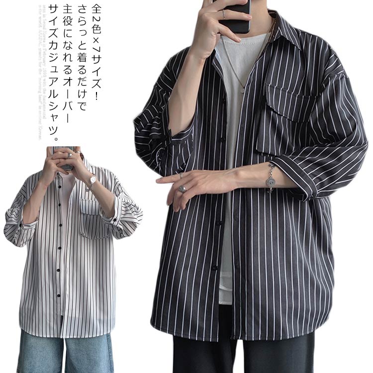全2色×7サイズ ストライプ柄シャツ ビッグシルエット シャツ メンズ 七分袖シャツ 大きサイズ カジュアルシャツ 7分袖 トップス 羽織り ゆったり オーバーサイズ 夏服 夏 夏物 お洒落